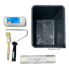 Flügger startsett – Malerbøtte – Bøttepose – Malerrulle – Rulleskaft – Vinkelpensel