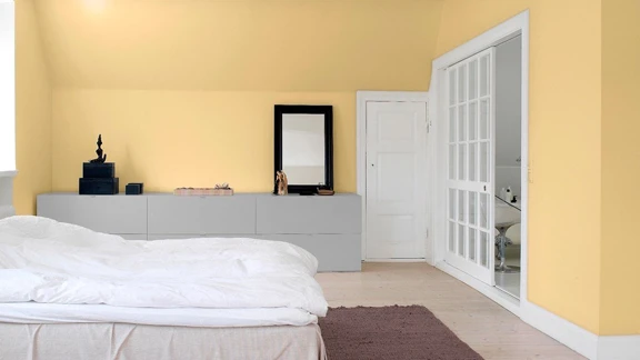 Gul skaper energi og egner seg ikke i alle nyanser til et soverom. Gul i dempet utgave kan bidra til det lyset, og den energien du kanskje har bruk for om morgenen. Den signaliserer friskhet uten å være overveldende og gir det nødvendige lyset i samspill med både kunstig og naturlig lys til soverommet.