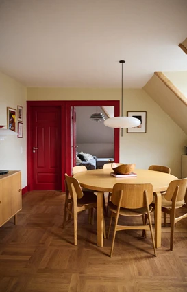 Kjøkkenet og spisestuen er malt i White Sand - en lys gyllen farge som på kjøkkenet spiller opp mot stålbenkeplaten og komplementerer de varme eikedørene. I spisestuen får White Sand motspill av de røde panelene i fargen 2408.