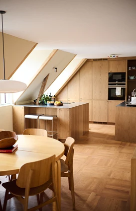- Oppnå et monokromt uttrykk ved å kombinere gylne, varme tresorter med en veggfarge i samme tone, slik Kavian har gjort på kjøkkenet sitt.