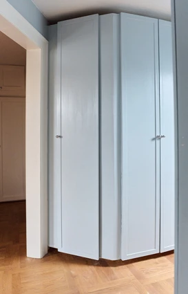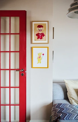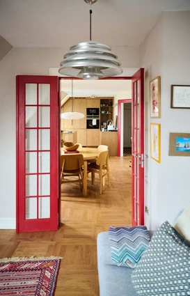 Entréen og spisestuen er malt i hver sin lyse farge - henholdsvis Brown Rose og Villa Juna, begge støvete beigetoner med en lett rød undertone som gir dem en myk og varm følelse. Den røde undertonen kompletteres av de røde dørene, og med de grå og blå elementene og lampen i kjølig metall oppnås en komplett visuell balanse.