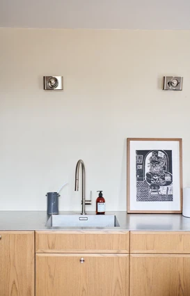 - Skap visuell balanse ved å kombinere kalde og varme materialer og farger, som for eksempel stål og blå elementer mot de støvete, varme tonene hos Kavian.