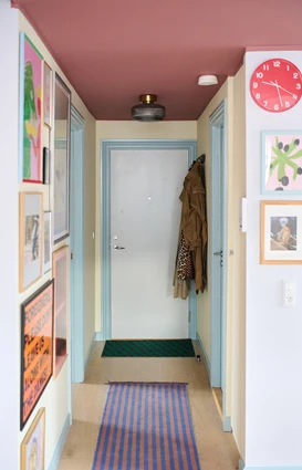 Leilighetens entré er en smal korridor uten naturlig lys. Med pastellfargen Pale Yellow på veggene har Belinda tilført lys og varme til det ellers mindre interessante rommet, som nå, som hun sier det, «det føles som om solen skinner inn». Sammen med den havblå Corsica på treverket og den støvete terrakottarøde Portofino i taket blir rommet levende og dynamisk.