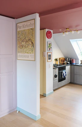 Hvite vegger, hvite fliser og et grått kjøkken. Slik så det ut før Belinda strødde sin fargemagi over den 90 kvadratmeter store borettslagsleiligheten. Hun ønsket å skape et personlig og inspirerende hjem som skulle danne rammen om hennes hverdag som hjemmeværende mor med sønnen Bille - og det prosjektet krevde farger. Med en baby på slep og en palett med åtte forskjellige farger fra Flügger80- fargekartet gikk Belinda og Jeppe i gang med prosjektet for å forvandle de nøytrale omgivelsene til et levende hjem. Den første fargen de valgte, var den støvrøde Portofino til takene i gangen, kjøkkenet og stuen. Ut fra denne kunne de velge de resterende fargene, som alle er lysere og lettere varianter av blått, rødt, lilla og gult, som spiller vakkert sammen med og nesten løfter det noe mørkere taket.