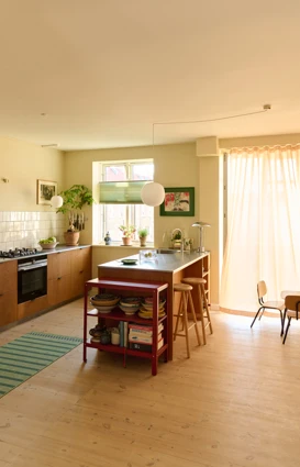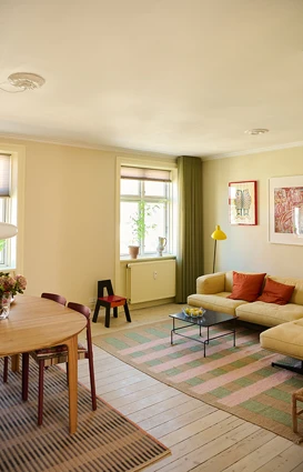 Da Josefine og kjæresten Andreas overtok andelsleiligheten på Nørrebro, var noe av det første de gjorde å lage en åpen løsning mellom kjøkkenet og de to stuene. Dermed fikk de en romslig utforming som gjenspeiler deres åpne tilnærming til samvær med både hverandre og gjester. I dag er det familiens samlingssted, og her er det ofte både kreative prosjekter og sofahopping på gang i tillegg til matlaging og gode samtaler over kjøkkenøya. For å fremheve sammenhengen mellom rommene er alle tre malt i samme farge, nemlig den varme og lyse White Sand, som gir et naturlig og avslappende uttrykk.