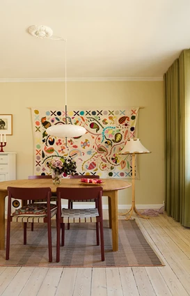 Når flere rom slås sammen for å skape en åpen romløsning, skal det litt mer til for å oppnå en hjemmekoselig stemning. Josefine har løst denne utfordringen med tekstiler som gir rommene forskjellige teksturer og visuell ro. Veggene får et mykere uttrykk med gardiner som går fra gulv til tak, og gulvteppene deler opp rommet i forskjellige soner – kjøkken, spisestue og sofaområde. Sist, men ikke minst har de et stort vintage-veggteppe ved spisebordet, og dette gir innredningen et flott og fargerikt preg. Tekstilene bidrar også til å forbedre akustikken i rommet.
