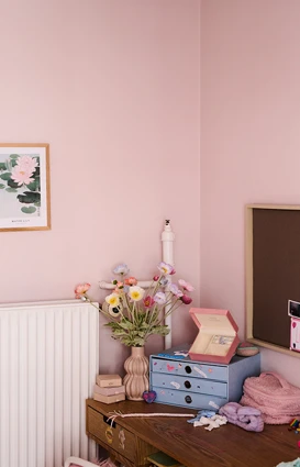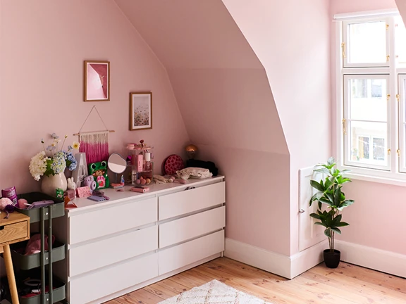 Barnerommene er de eneste rommene i huset der noe annet enn jordfarger har fått komme til. På Albas rom finner man den duse lyserøde fargen Ballet Shoes.