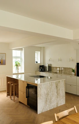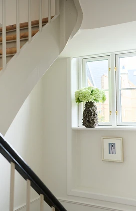Det siste oppussingsprosjektet er familiens rekkehus på 143 m2. Da Line og ektemannen Jeppe kjøpte huset på Østerbro, var det delt inn i tre separate leiligheter. Disse har de slått sammen for å oppnå et tre-etasjes hus med plass til hele familien. Flere vegger ble revet, og den gamle oppgangen med en flott trapp ble en del av det «nye» huset. De fikk et stort og åpent kjøkken som siden har blitt familiens samlingssted. Paret har brukt håndverkere til de tyngre delene av jobben, men Line har selv satt prikken over i-en ved hjelp av varme jordfarger og en rekke integrerte møbler og detaljer.