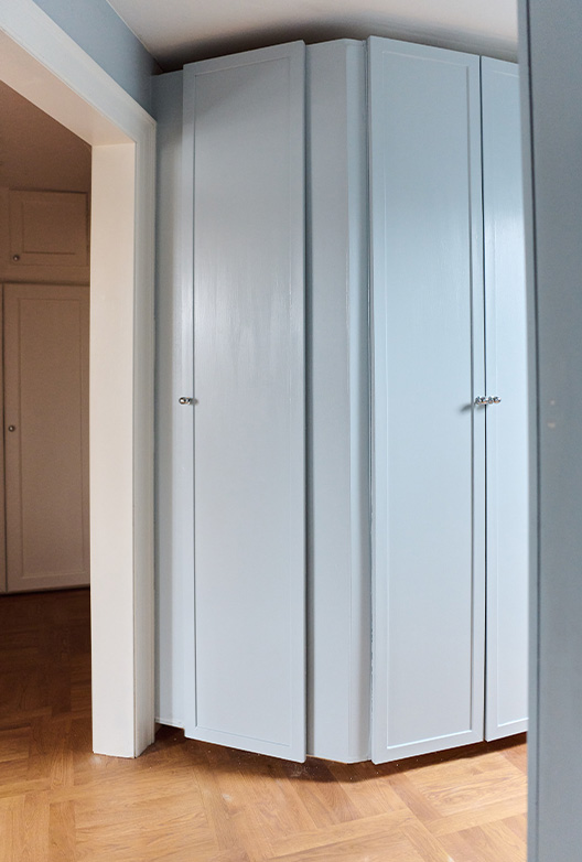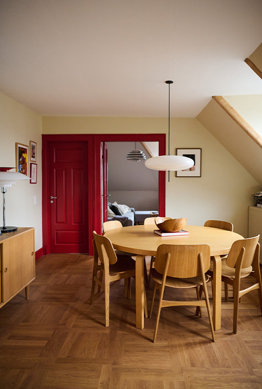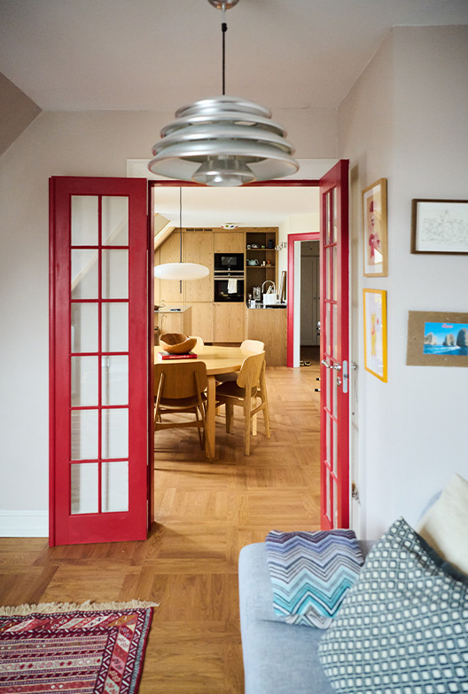 Entréen og spisestuen er malt i hver sin lyse farge - henholdsvis Brown Rose og Villa Juna, begge støvete beigetoner med en lett rød undertone som gir dem en myk og varm følelse. Den røde undertonen kompletteres av de røde dørene, og med de grå og blå elementene og lampen i kjølig metall oppnås en komplett visuell balanse.