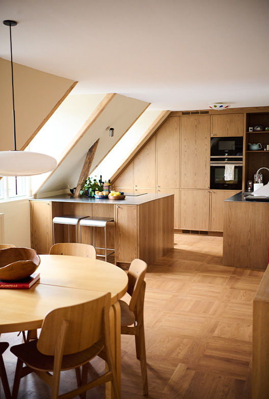 - Oppnå et monokromt uttrykk ved å kombinere gylne, varme tresorter med en veggfarge i samme tone, slik Kavian har gjort på kjøkkenet sitt.