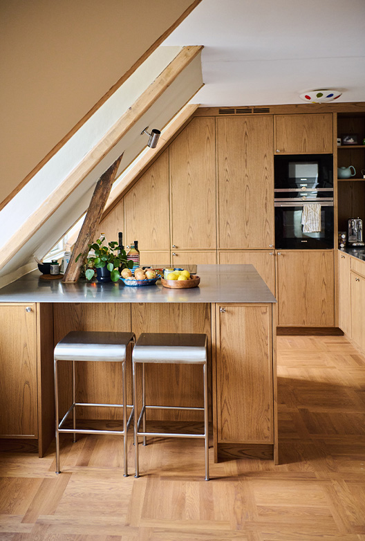 "Jeg liker spesielt kjøkkenet, som kombinerer materialer som både er praktiske og estetisk tiltalende. Benkeplaten i børstet stål gir et moderne og industrielt uttrykk, som står i fin kontrast til de varme tredørene som har en klassisk og koselig sjarm."
