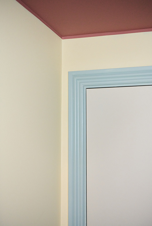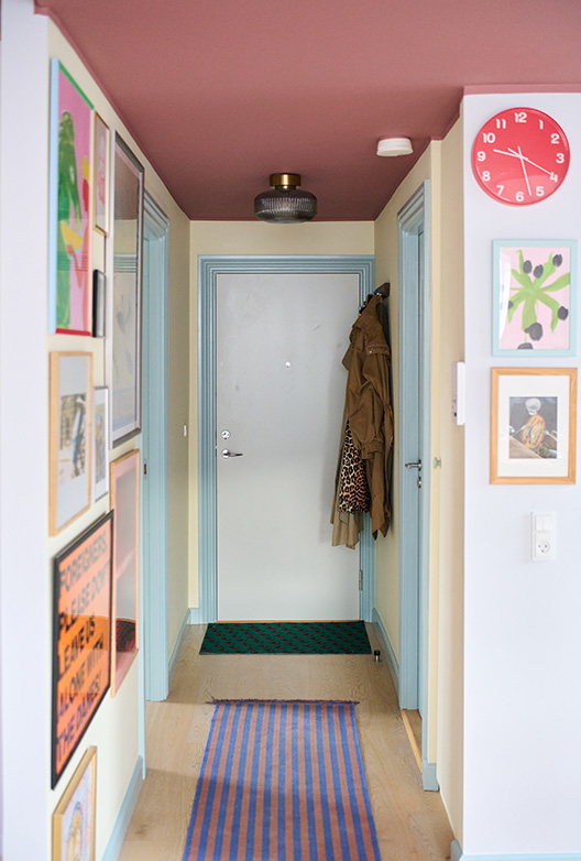 Leilighetens entré er en smal korridor uten naturlig lys. Med pastellfargen Pale Yellow på veggene har Belinda tilført lys og varme til det ellers mindre interessante rommet, som nå, som hun sier det, «det føles som om solen skinner inn». Sammen med den havblå Corsica på treverket og den støvete terrakottarøde Portofino i taket blir rommet levende og dynamisk.