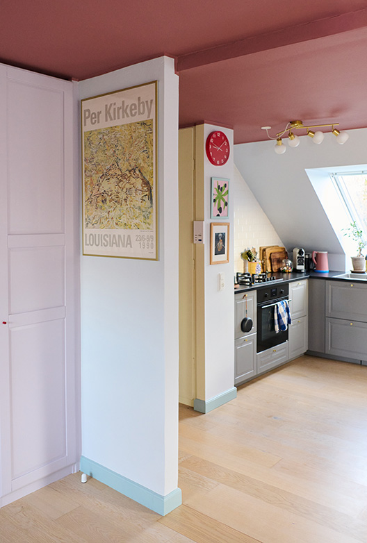 Hvite vegger, hvite fliser og et grått kjøkken. Slik så det ut før Belinda strødde sin fargemagi over den 90 kvadratmeter store borettslagsleiligheten. Hun ønsket å skape et personlig og inspirerende hjem som skulle danne rammen om hennes hverdag som hjemmeværende mor med sønnen Bille - og det prosjektet krevde farger. Med en baby på slep og en palett med åtte forskjellige farger fra Flügger80- fargekartet gikk Belinda og Jeppe i gang med prosjektet for å forvandle de nøytrale omgivelsene til et levende hjem. Den første fargen de valgte, var den støvrøde Portofino til takene i gangen, kjøkkenet og stuen. Ut fra denne kunne de velge de resterende fargene, som alle er lysere og lettere varianter av blått, rødt, lilla og gult, som spiller vakkert sammen med og nesten løfter det noe mørkere taket.
