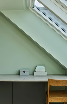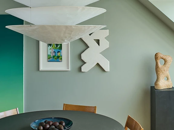 Han har lenge unngått trenden med farger i hjemmet fordi han mente det var en for enkel måte å gjøre hjemmet sitt interessant på, men i dag ser han annerledes på det: "Jeg må erkjenne at det er noe i det. De fargene vi tiltrekkes av i naturen er aldri beige og brunt, så hvorfor skulle man male hjemmet sitt i de fargene?", sier Emil Thorup, som nå har innredet et hjem med farger for andre gang. Denne gangen var det imidlertid viktig for ham å finne tilbake til den stramheten som kjennetegner stilen hans: "Forrige gang gikk vi litt for vilt til verks med fargene, så denne gangen valgte vi én farge til alt treverk for å skape en bedre sammenheng", sier Emil, som i tillegg til Dark Teal til treverket har valgt fem nyanser av grønt til veggene: Sage, Fine Fig, Viggo og Iceland. De fem nyansene av grønn er innenfor samme skala, noe som skaper ro og sammenheng i hele hjemmet.