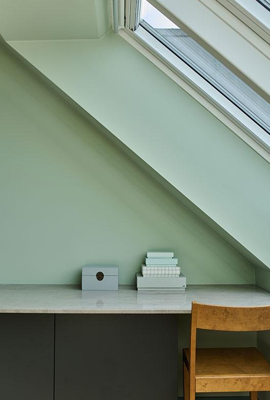 Han har lenge unngått trenden med farger i hjemmet fordi han mente det var en for enkel måte å gjøre hjemmet sitt interessant på, men i dag ser han annerledes på det: "Jeg må erkjenne at det er noe i det. De fargene vi tiltrekkes av i naturen er aldri beige og brunt, så hvorfor skulle man male hjemmet sitt i de fargene?", sier Emil Thorup, som nå har innredet et hjem med farger for andre gang. Denne gangen var det imidlertid viktig for ham å finne tilbake til den stramheten som kjennetegner stilen hans: "Forrige gang gikk vi litt for vilt til verks med fargene, så denne gangen valgte vi én farge til alt treverk for å skape en bedre sammenheng", sier Emil, som i tillegg til Dark Teal til treverket har valgt fem nyanser av grønt til veggene: Sage, Fine Fig, Viggo og Iceland. De fem nyansene av grønn er innenfor samme skala, noe som skaper ro og sammenheng i hele hjemmet.
