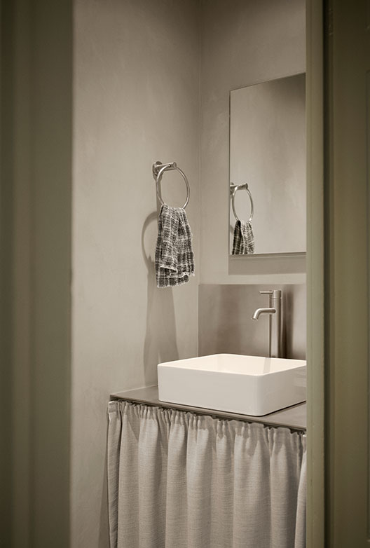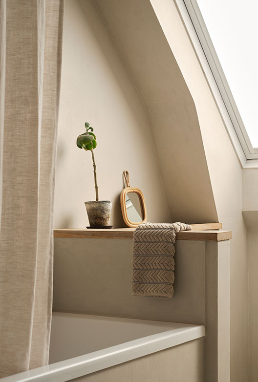 "På badet valgte jeg Bloom fordi den ligger nær fargen på flisene og passer til det som allerede var der. Det er en delikat rosa grå farge, uten å være for rosa, og den skaper et rolig uttrykk. På gjestetoalettet brukte vi Pale Beach overalt, på taket, veggene og gulvet. Det er et veldig lite rom, og det skaper en fin effekt. Jeg liker også at Pale Beach går igjen på spisebordet, hvor vi har forseglet overflaten slik at den tåler daglig bruk. Det binder alt sammen."