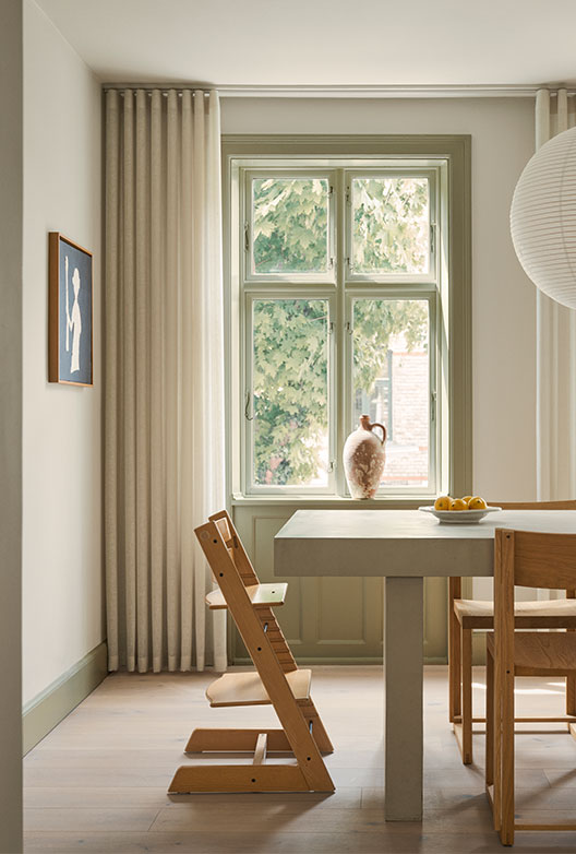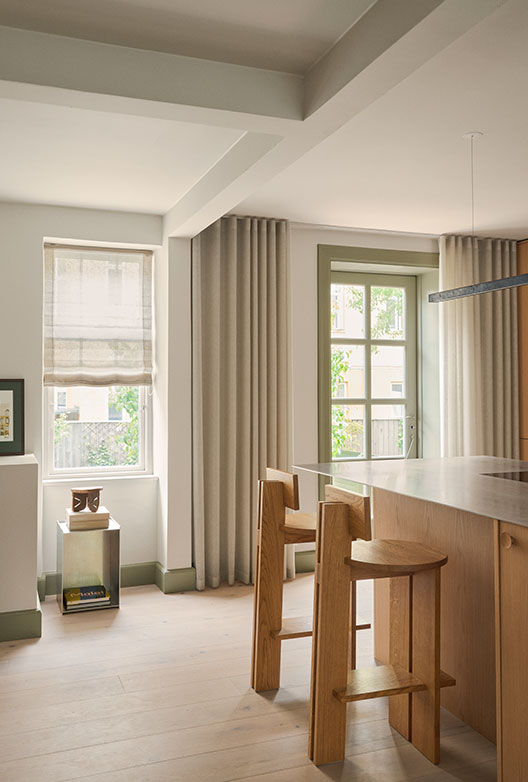 Det gamle treverket ble malt i fargen Moss Flügger 80, en kjølig grønnfarge som fortsetter tonen i dørene og panelene. På denne måten blir rommene samlet, slik at bevegelsen fra etasje til etasje blir en del av fortellingen.