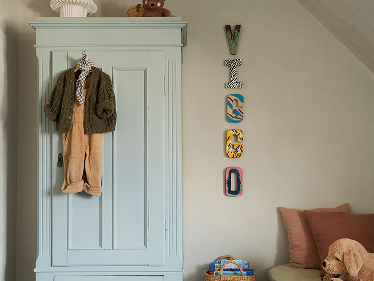 "Vi brukte KABRIC Mushroom på veggene og taket for å skape en base med dybde. Gjenbrukte funn fikk nytt liv med maling, et skap i Flügger 80 Bornholm, et bord i Bloody Mary, en kommode i Stockholm, og gulvet i Pale Olive binder det hele sammen. Ikke alt må være rolig i et barnerom, men det må henge sammen. Når du har en plan, blir det mye lettere å få fargene til å fungere sammen."