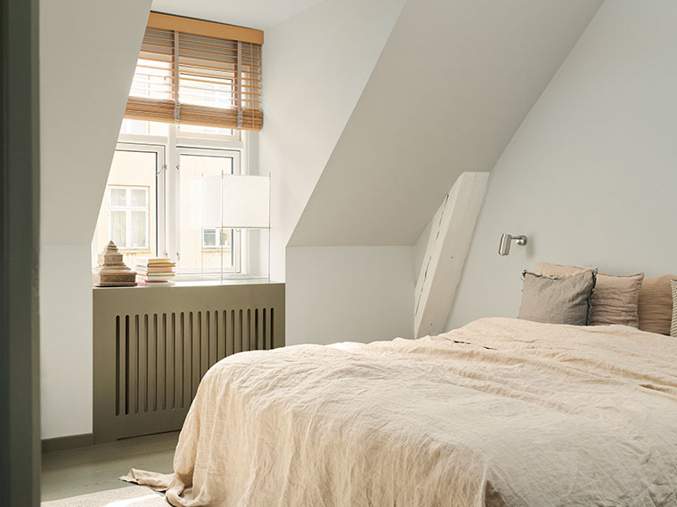 Soverommet viser hvordan kontraster kan skape ro. Veggene er malt i Arken, en lys blå farge, mens gulvet er malt i Mocha Flügger 80, en dyp brun-grønn farge som fortsetter opp på panelene og radiatorene. På papiret kan det virke intenst, men i rommet er effekten rolig.