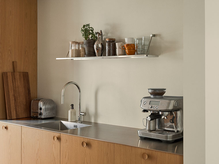 "Jeg liker kontraster. Det harde stålet fra kjøkkenet sammen med organiske former og materialer. Vi har spotlights i stål, og jeg elsker lampene i rispapir. Det er møtet mellom dem som gjør det interessant. Fargene binder det hele sammen, og det malte treverket gir en sterk følelse av hjem."