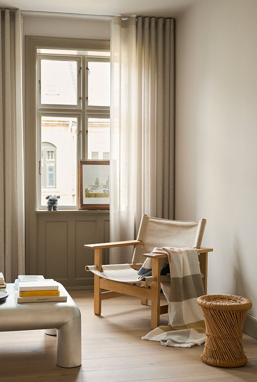 Stuen ligger i første etasje. Her er veggene også malt i Warm Nara, men treverket er malt i Truffle Flügger 80. Dette skaper et annet samspill med dagslyset, slik at møbler og kunstverk fremheves mot de malte flatene.