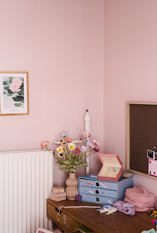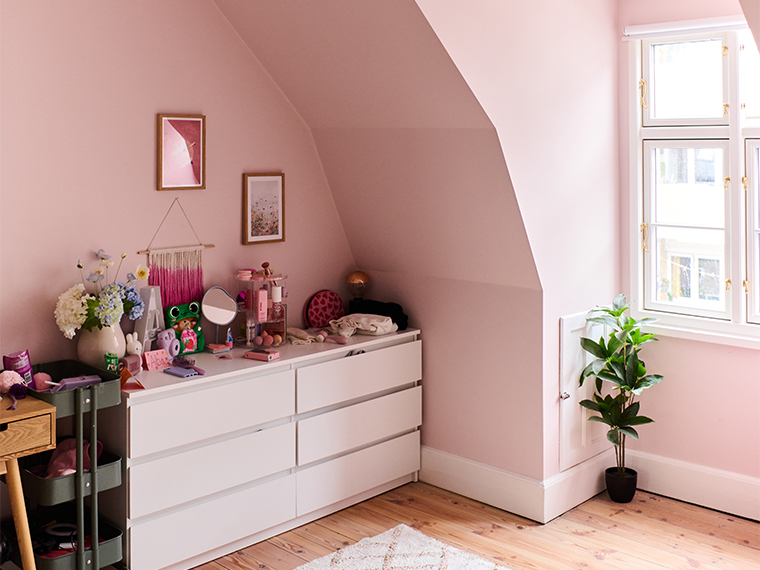 Barnerommene er de eneste rommene i huset der noe annet enn jordfarger har fått komme til. På Albas rom finner man den duse lyserøde fargen Ballet Shoes.