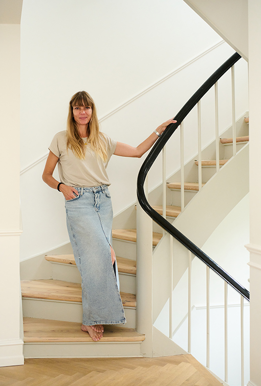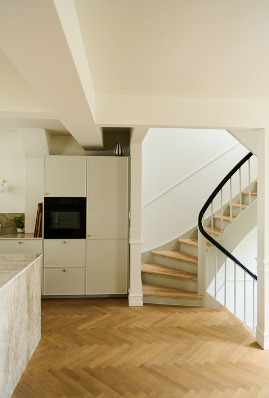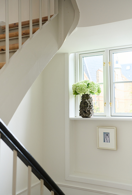 Det siste oppussingsprosjektet er familiens rekkehus på 143 m2. Da Line og ektemannen Jeppe kjøpte huset på Østerbro, var det delt inn i tre separate leiligheter. Disse har de slått sammen for å oppnå et tre-etasjes hus med plass til hele familien. Flere vegger ble revet, og den gamle oppgangen med en flott trapp ble en del av det «nye» huset. De fikk et stort og åpent kjøkken som siden har blitt familiens samlingssted. Paret har brukt håndverkere til de tyngre delene av jobben, men Line har selv satt prikken over i-en ved hjelp av varme jordfarger og en rekke integrerte møbler og detaljer.