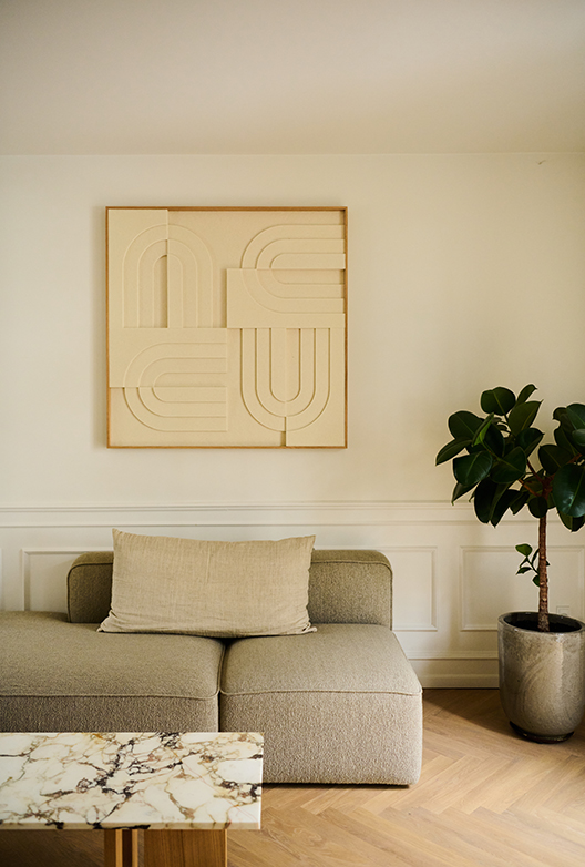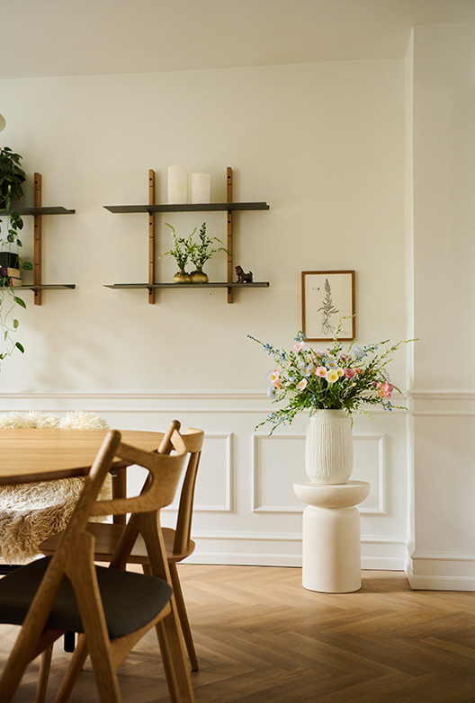 Lines følgere spør ofte om fargene hun har i hjemmet. Gjennom årene har hun hatt like mange fargekombinasjoner som boliger, men det er nå jordnære farger som preger innredningen hjemme hos henne. På kjøkkenet finner man Sand Shade 1 på både vegger og tak, og denne passer godt sammen med gulvet i eik og benkeplaten i stein. Til stuene har Line valgt den litt mørkere Sand Shade 3, der skaber et blødt og roligt lys i rummene. Både vægge og lofter har Line malet med Dekso 1, som gir rommene et mykt og rolig uttrykk. Vegger og tak er malt med Dekso 1, som har en matt og jevn overflate. Til tross for den matte overflaten er malingen lett å rengjøre, og det kommer godt med når man har tre barn i huset.