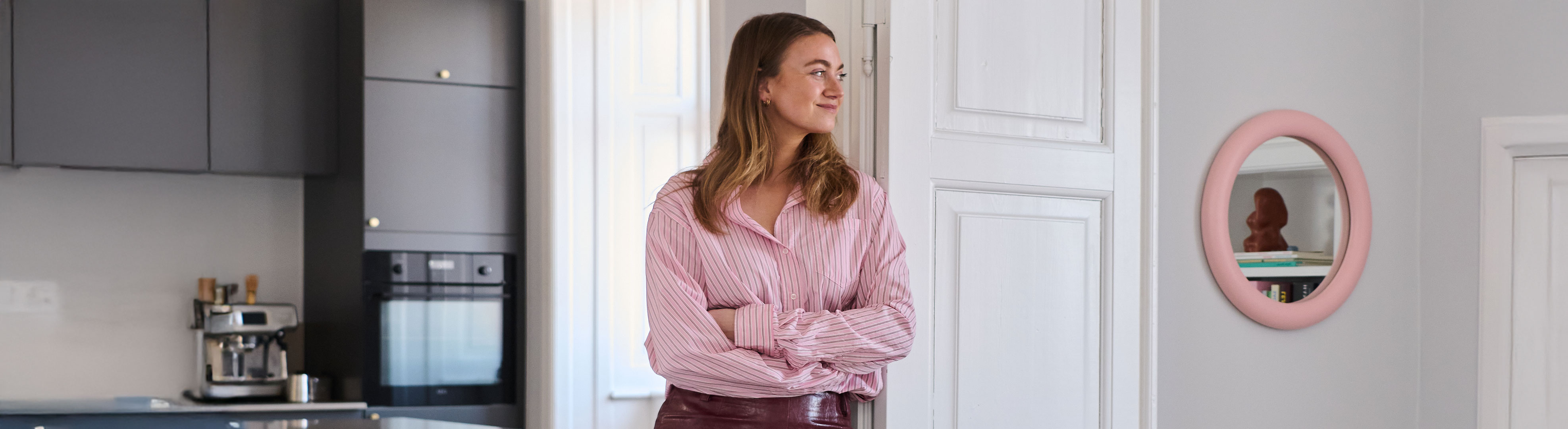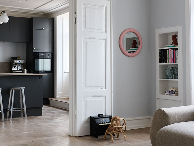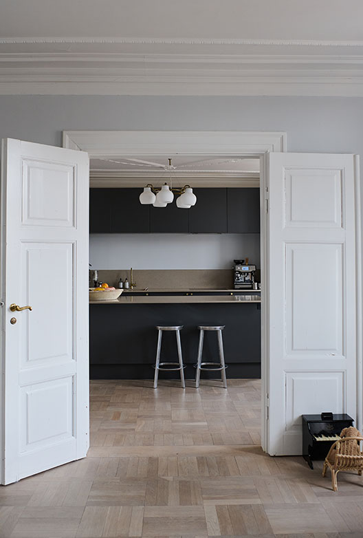 Leiligheten på Amager tilhørte tidligere Jonathans bestefar. I dag er den totalrenovert. De tunge lagene er borte, og lyset får strømme gjennom rommene, med utsikt over takene og himmelen. Her har Sophie skapt et fristed for seg selv og familien.