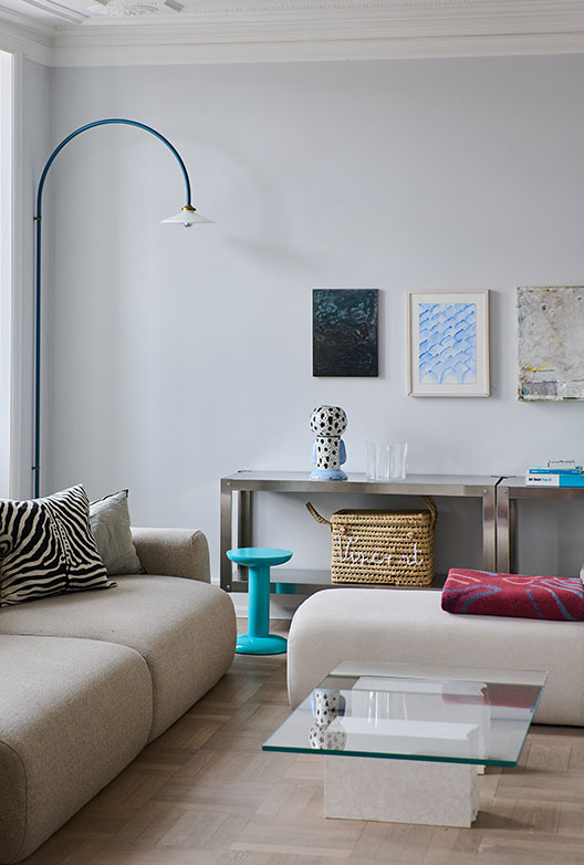 Sofie vender tilbake til en palett av støvete grå- og blåtoner som varer over tid og på tvers av rom. Den gråaktige tonen er spesiell fordi den endrer seg med dagslyset og binder materialene sammen.