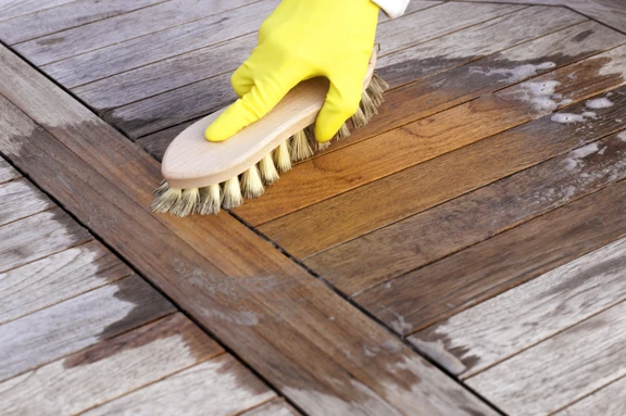 - Bruk en kost eller børste til å skrubbe treverket godt.