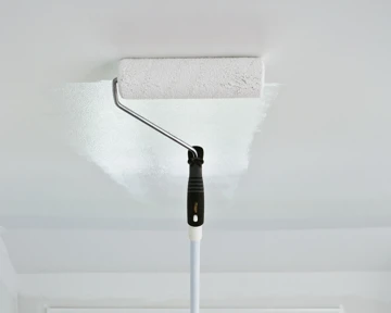 - Påfør takmaling med en pensel langs kanter og bruk en malerulle til større areal. Vi anbefaler at man bruker en teleskopstang så man kan male med lange strøk i taket.
