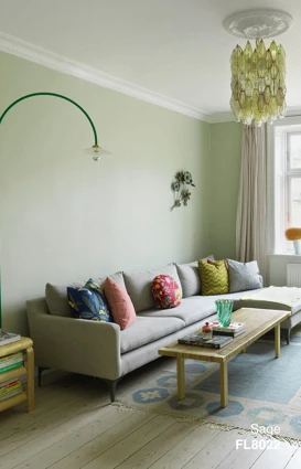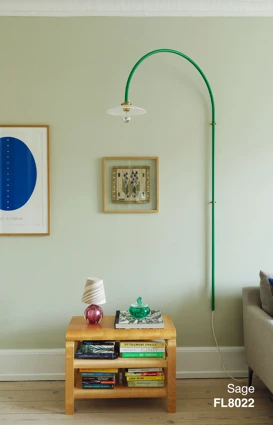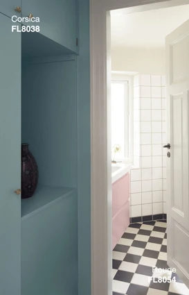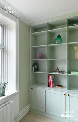 For å skape sammenheng mellom nytt og gammelt er leilighetens innbygde møbler også malt i blågrønne nyanser. I stuen er den store reolen, som viser mange av Frederikkes vintageglassvaser, malt i den kjølige mintgrønne "Iceland", som vakkert komplementerer den lysegrønne "Sage" på veggen. I gangen prydes enda en innebygd reol av en blå nyanse - nemlig den lett støvede "Corsica".