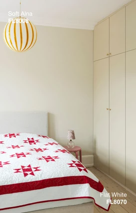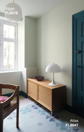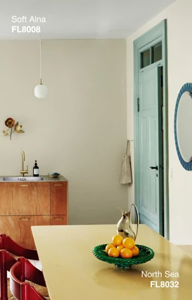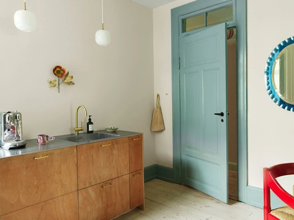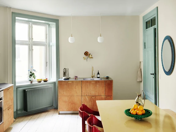 Ønsket om å skape en levende atmosfære har ført til at leiligheten ikke har noen hvite vegger. Likevel har Frederikke valgt dempede nyanser til alle hjemmets store flater for å skape sammenheng mellom rommene og danne en tidløs bakgrunn som enkelt tilpasser seg de kontinuerlige endringene i innredningen. På kjøkkenet skaper "Soft Alna" en varm og innbydende stemning - perfekt for et rom som ofte danner rammen for koselige middager med venner og familie for Frederikke og Emil.
