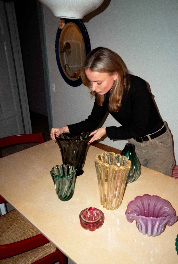 Interessen for vintage design oppstod da Frederikke for åtte år siden studerte og bodde i Milano. Det utviklet seg til en lidenskap, og i dag lever hun av å selge vintage glasskunst og møbler – hovedsakelig fra Italia – i Millefiori Interior, som hun driver sammen med søsteren sin, Natasha. Den sørlige inspirasjonen gjenspeiles tydelig i Frederikkes innredning, der gyldne nyanser i samspill med levende grønne og blå toner assosierer til varme himmelstrøk, mens mønstrede tekstiler, samt sterke røde og gule farger i hjemmets kunst og interiør, skaper en vakker og livlig kontrast.