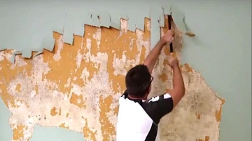 - Bruk en tapetskrape eller en bred sparkel for å fjerne det første laget med tapet.